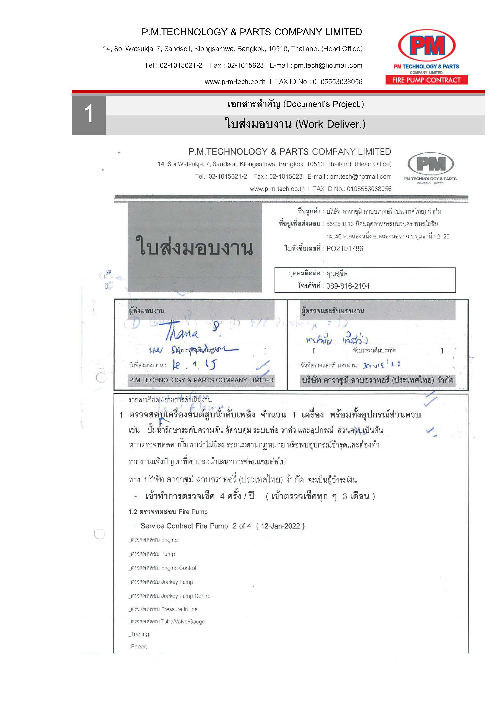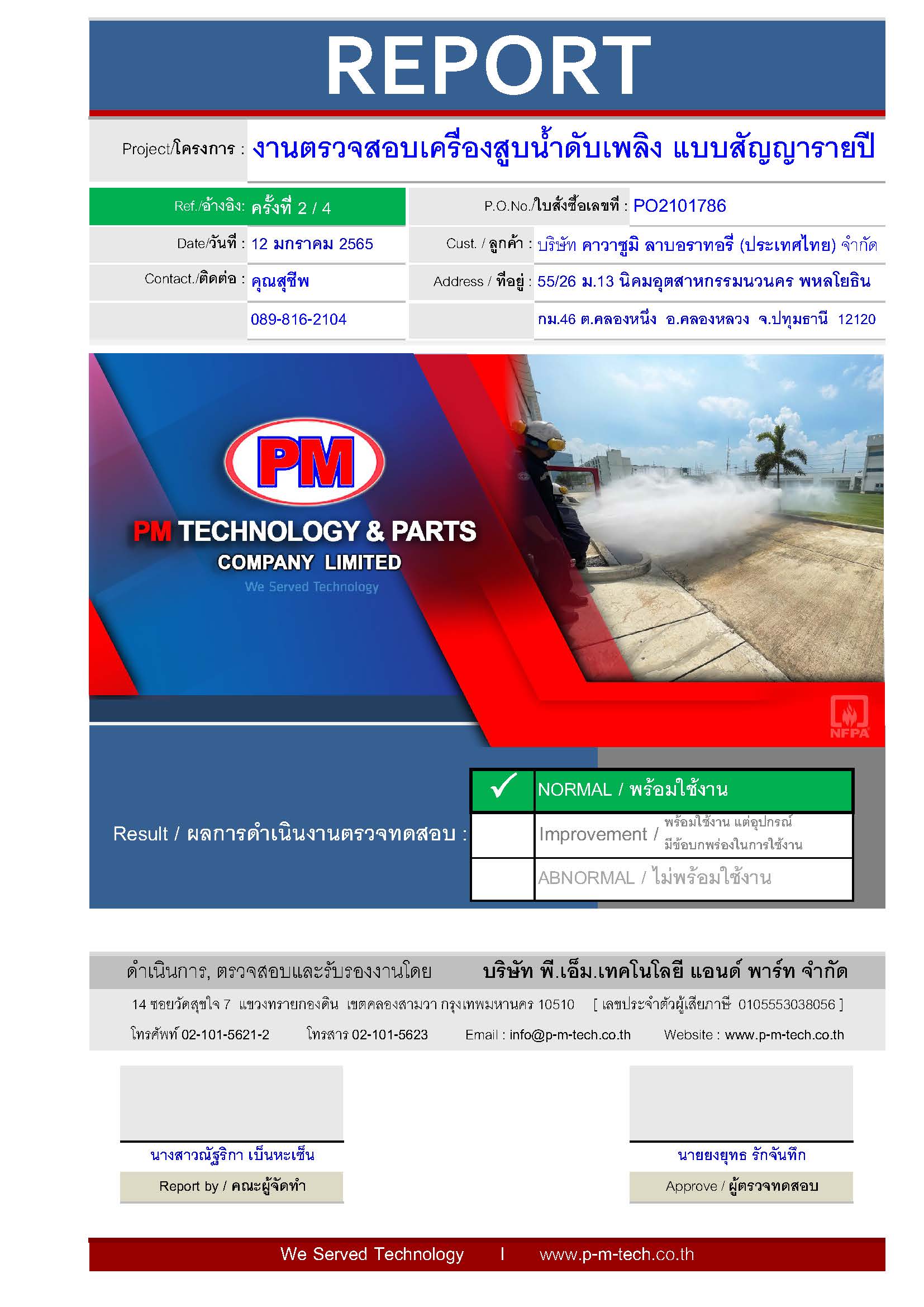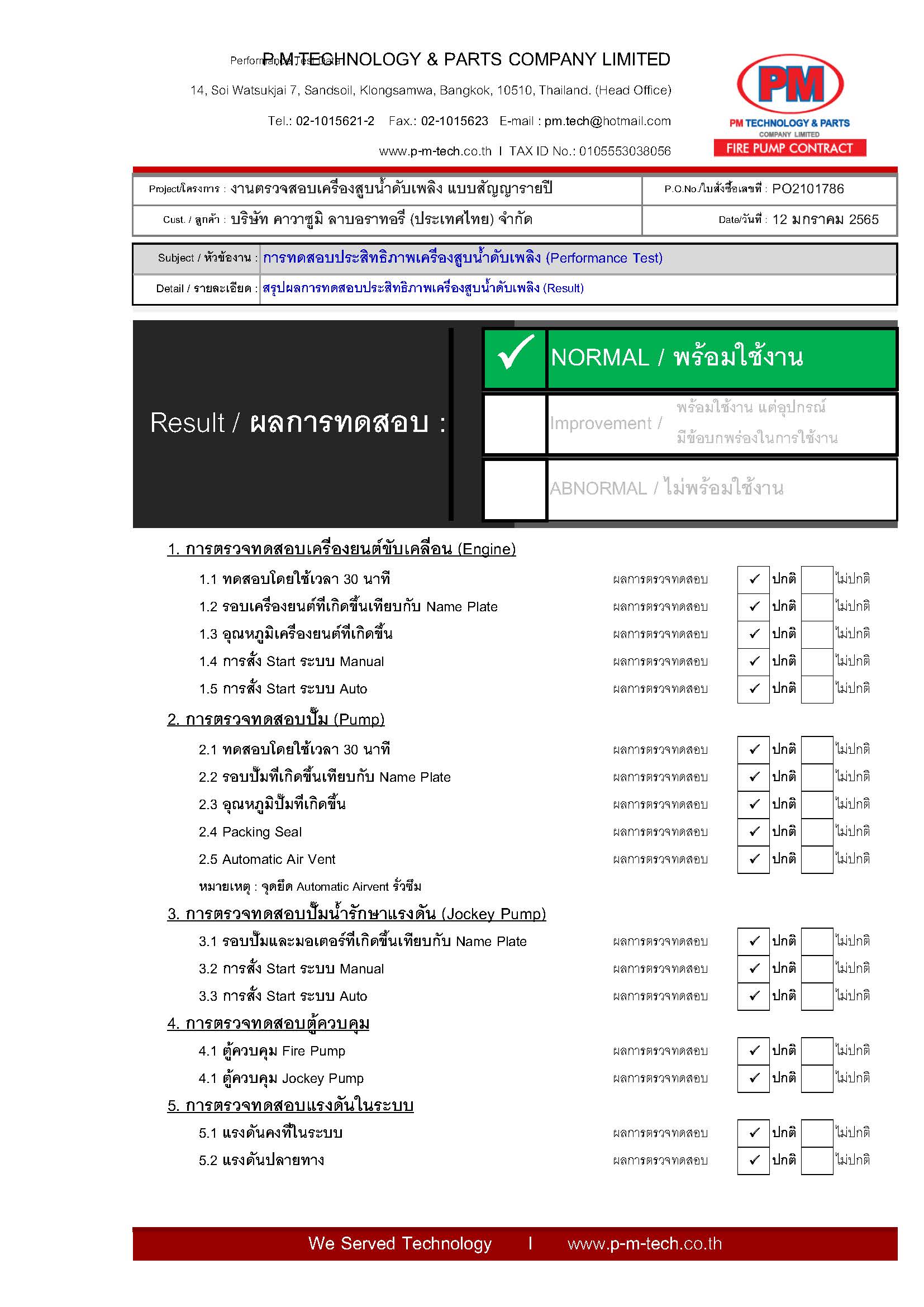 เข้าตรวจสอบ และทดสอบระบบ Fire Pump กว่า 25 รายการแบบสัญญารายปี (ไตรมาสละ 1 ครั้ง) พร้อม REPORT ทุกครั้งที่เข้าตรวจทดสอบ