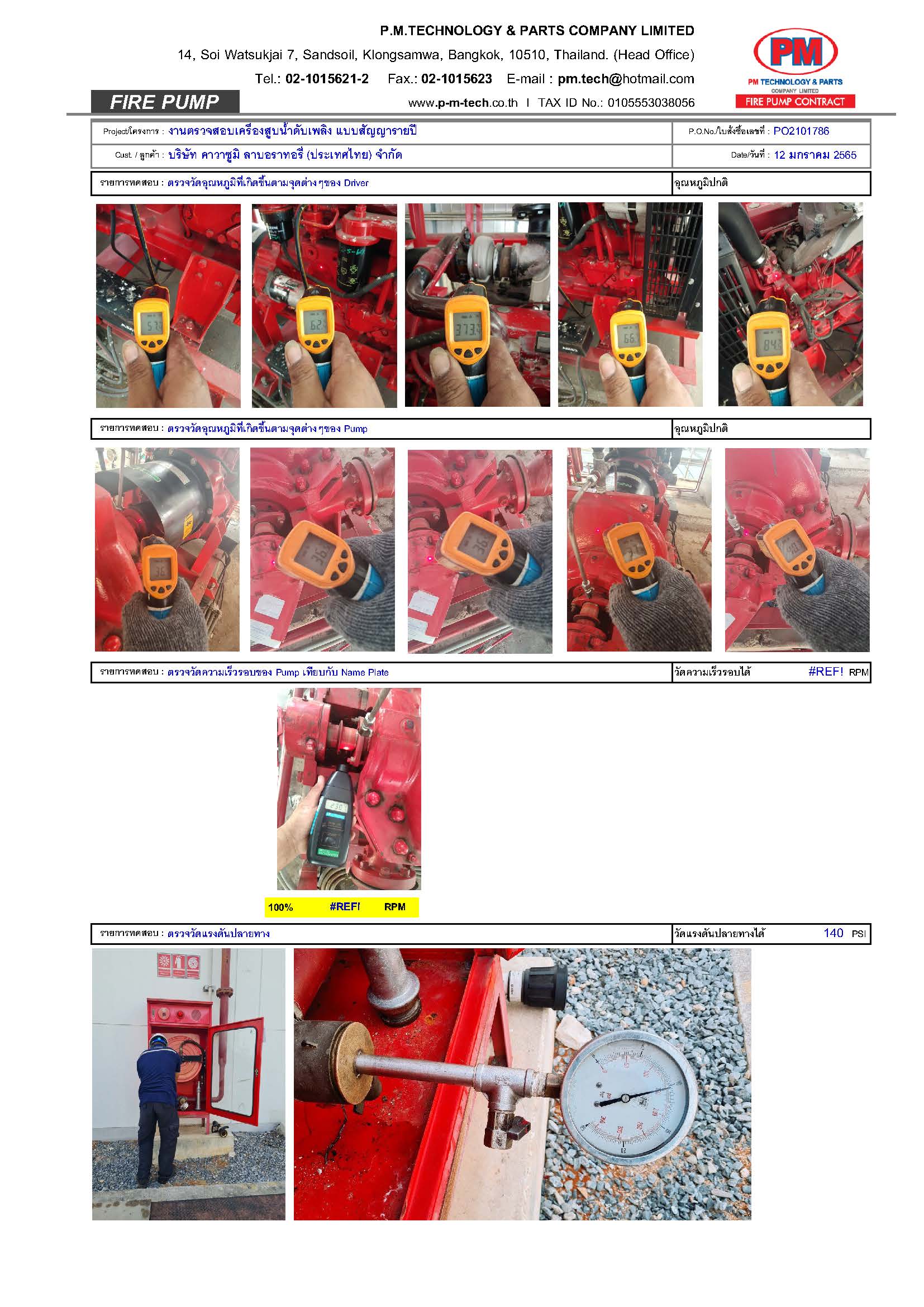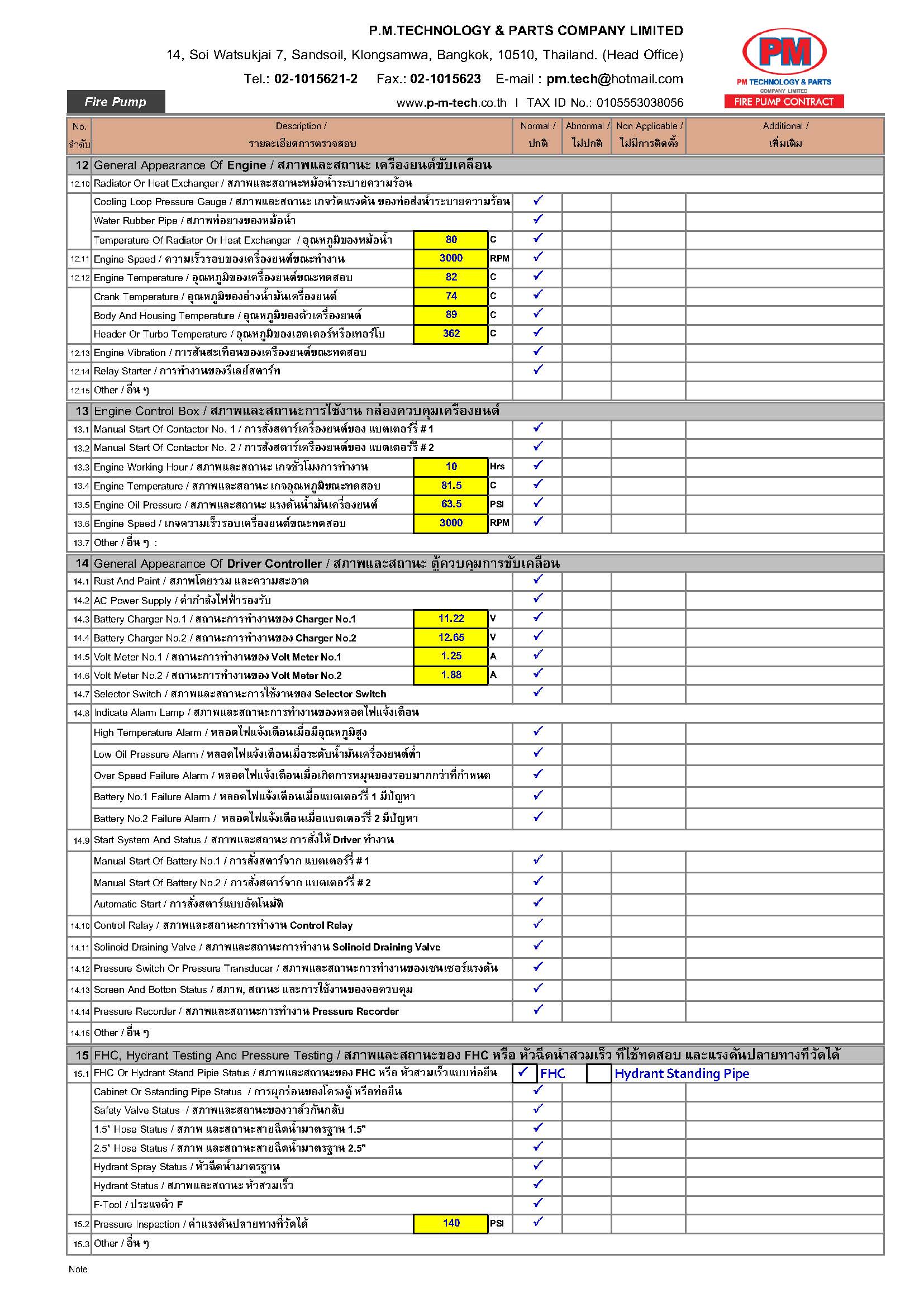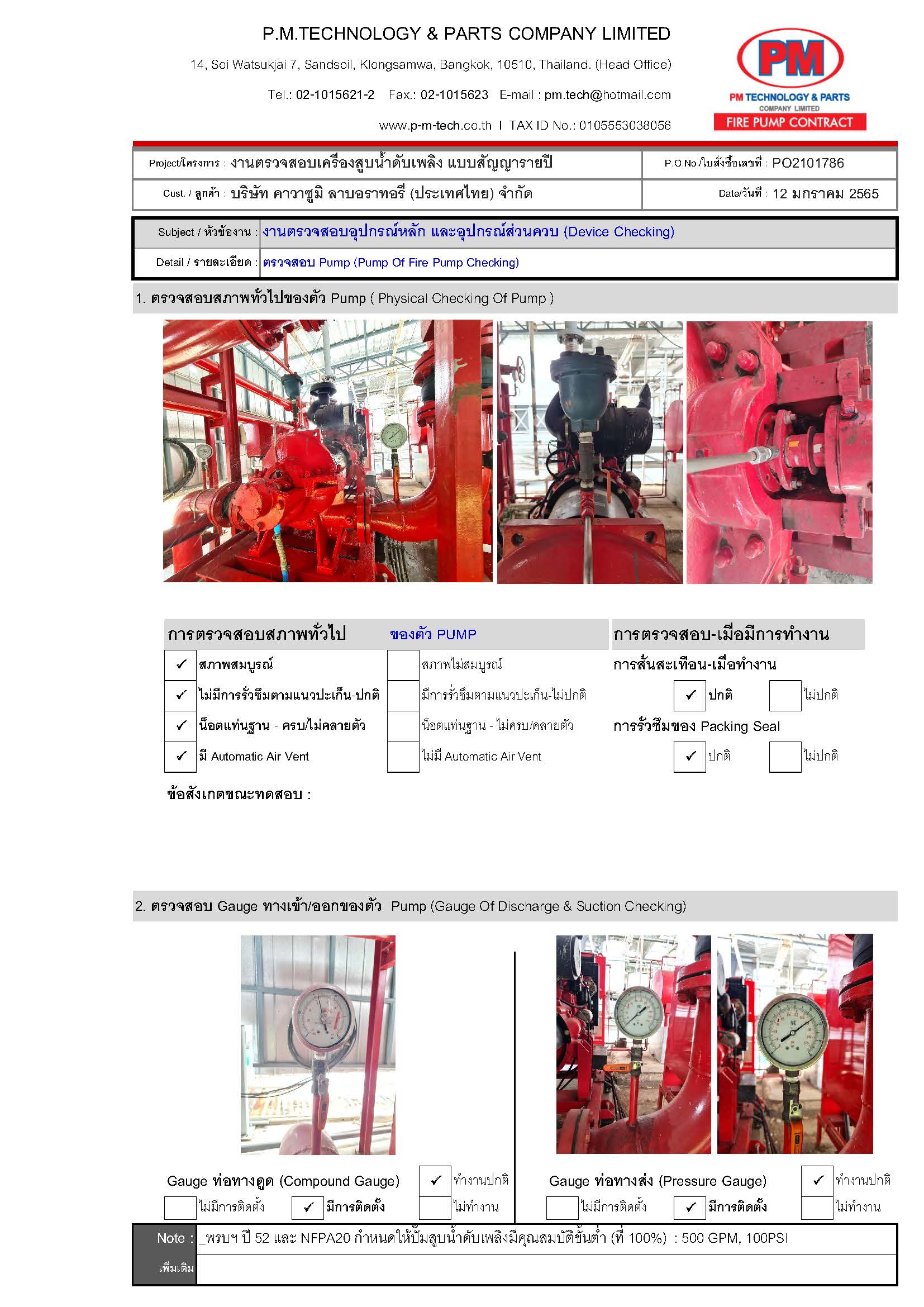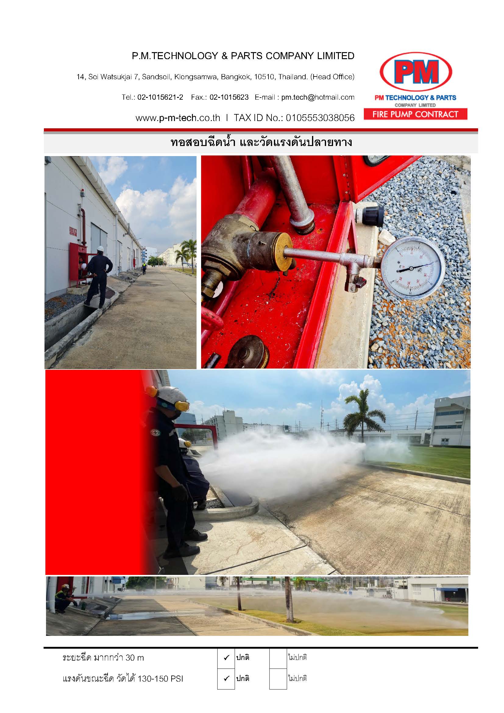 2. ตรวจสอบปั๊มดับเพลิง / แรงดันด้านดูด / แรงดันด้านส่ง / ความเร็วรอบ / อุณหภูมิ / ค่าการสั่นสะเทือน ฯลฯ