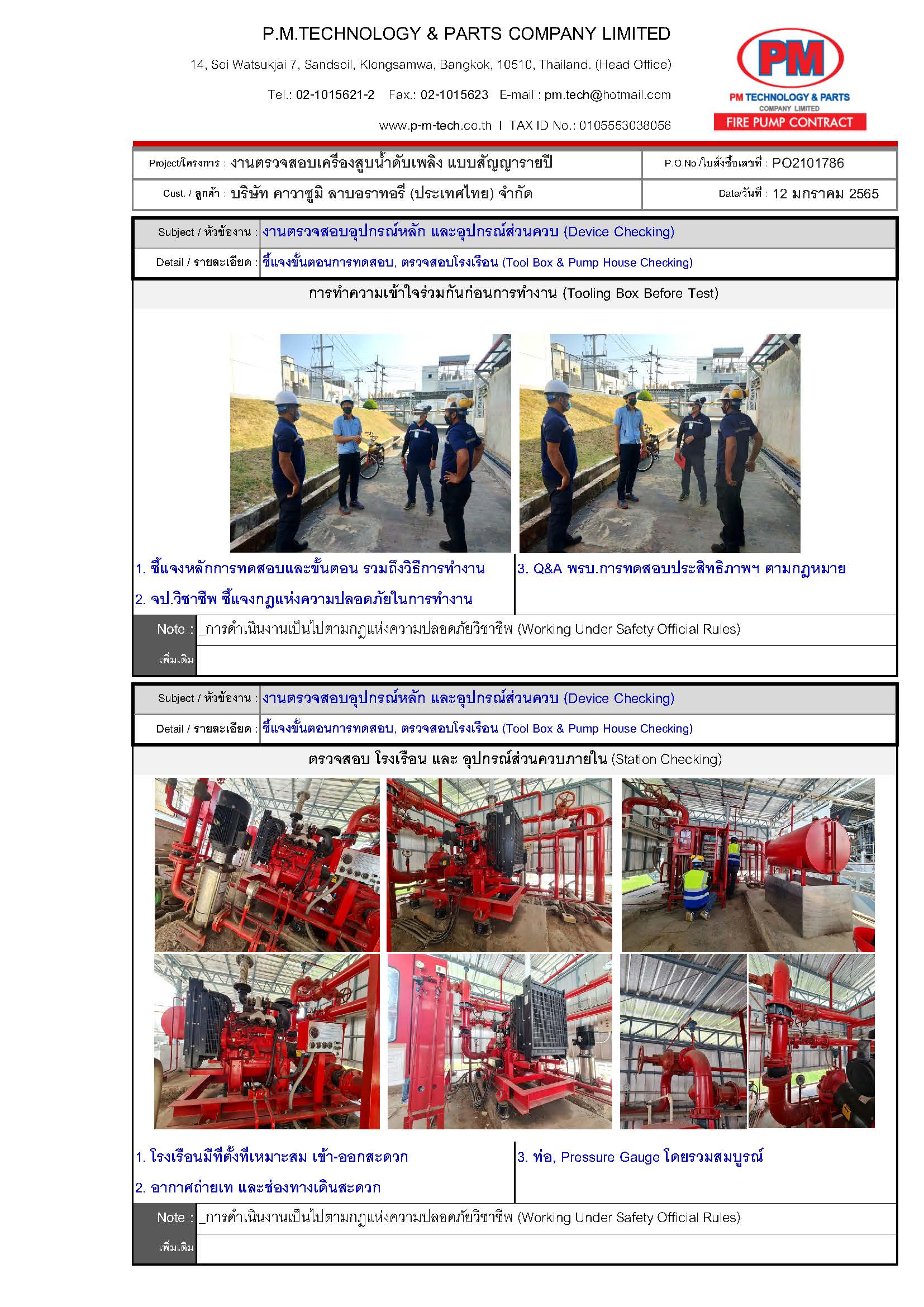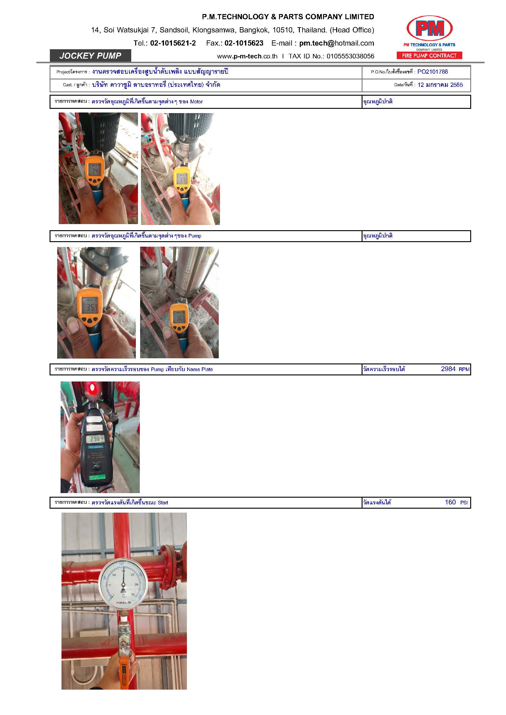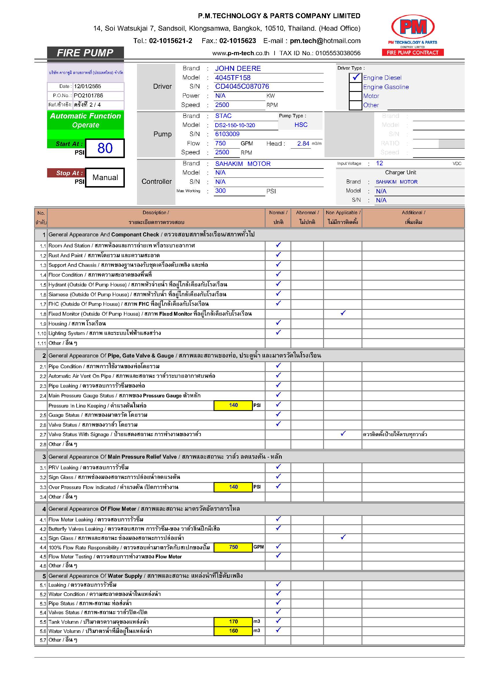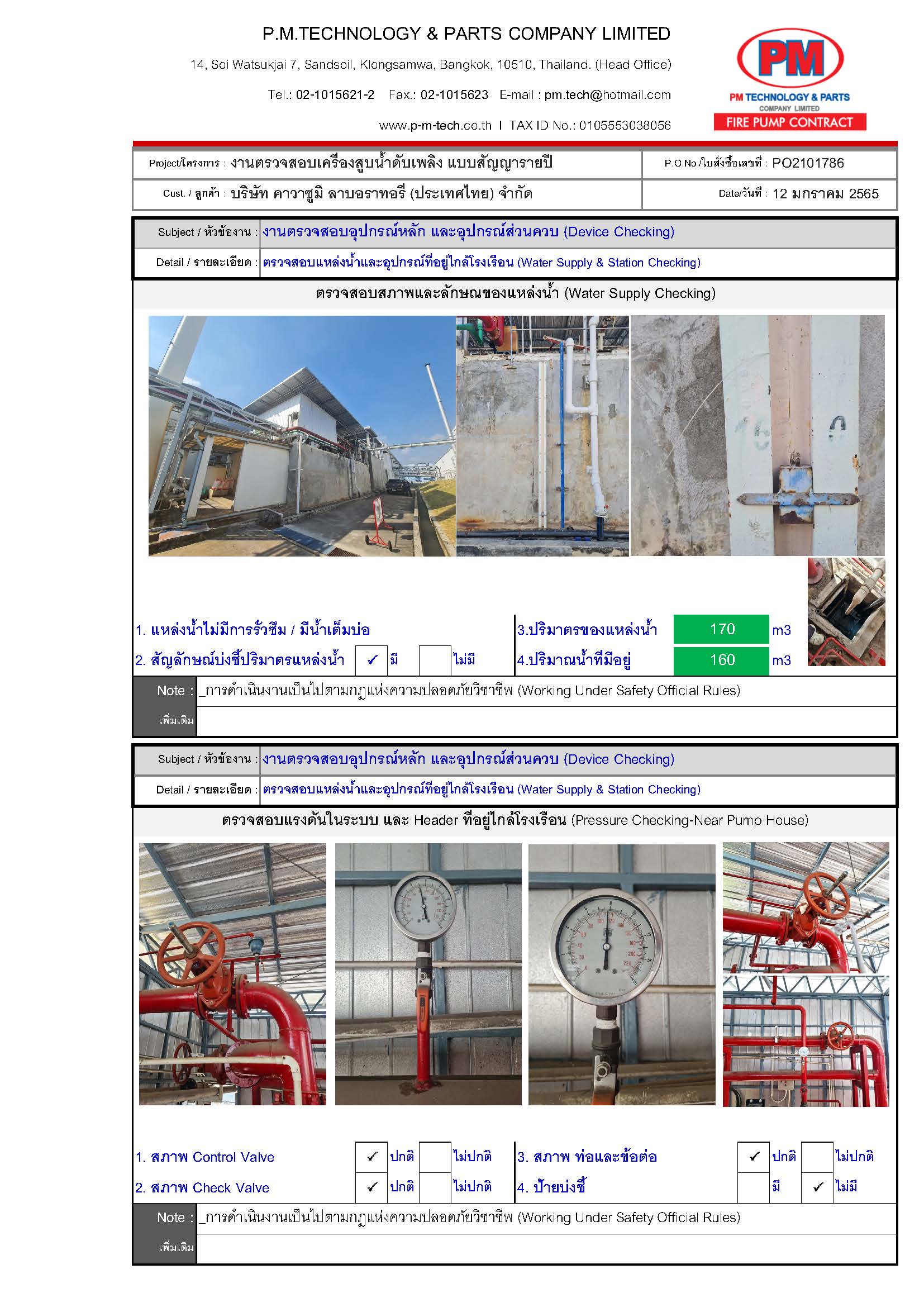 2. ตรวจสอบปั๊มดับเพลิง / แรงดันด้านดูด / แรงดันด้านส่ง / ความเร็วรอบ / อุณหภูมิ / ค่าการสั่นสะเทือน ฯลฯ