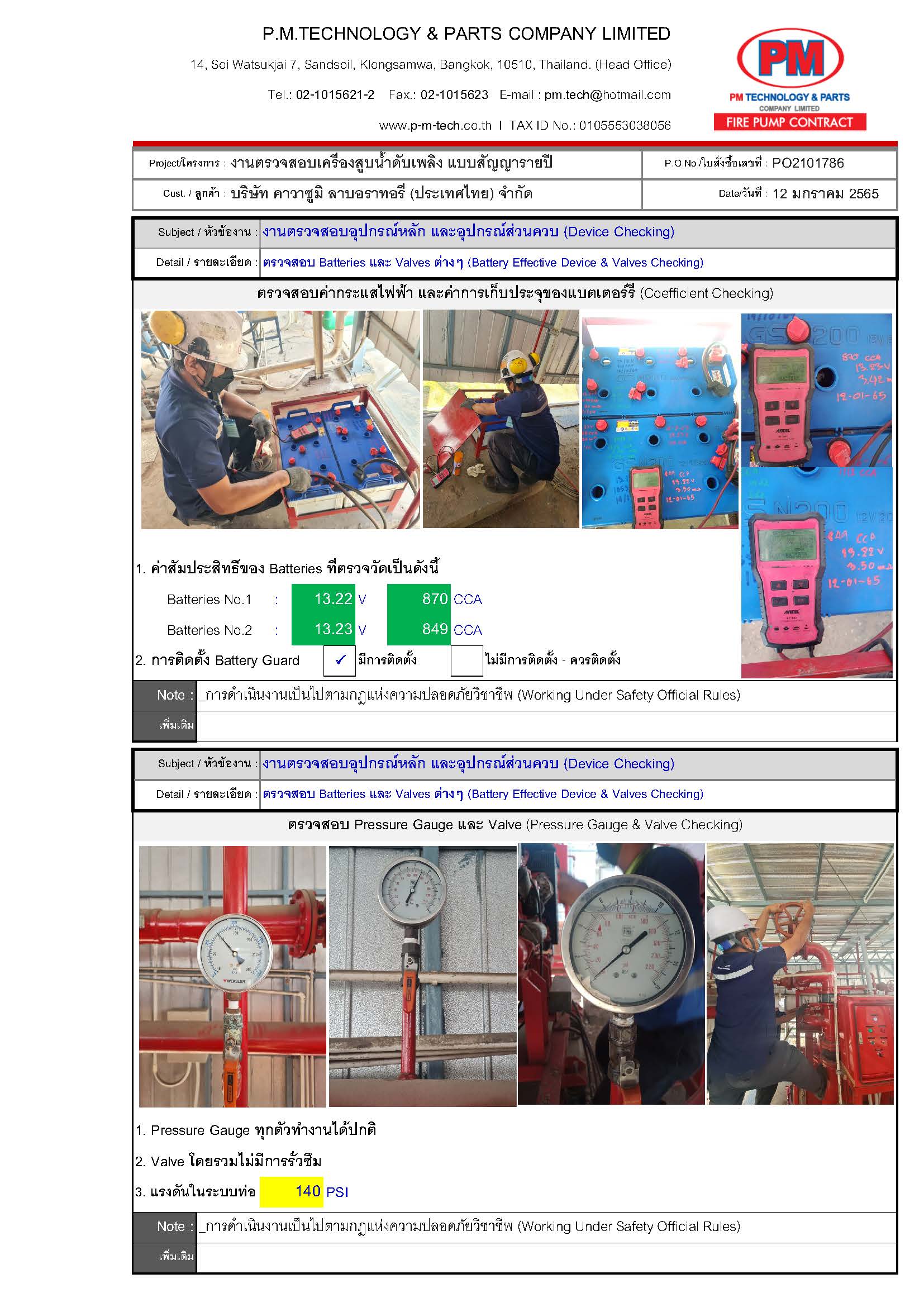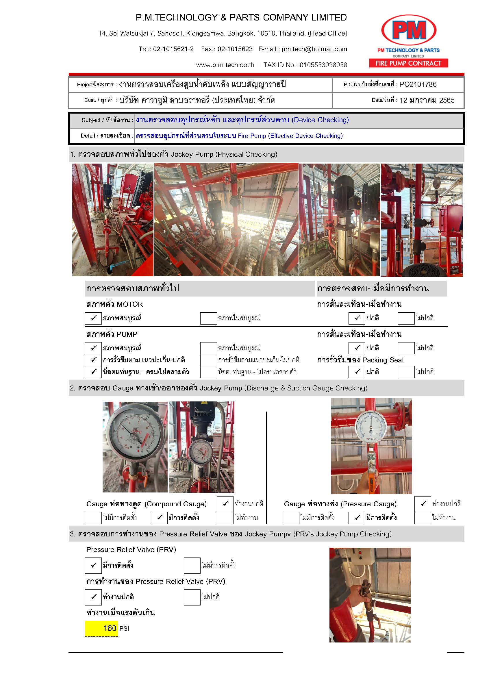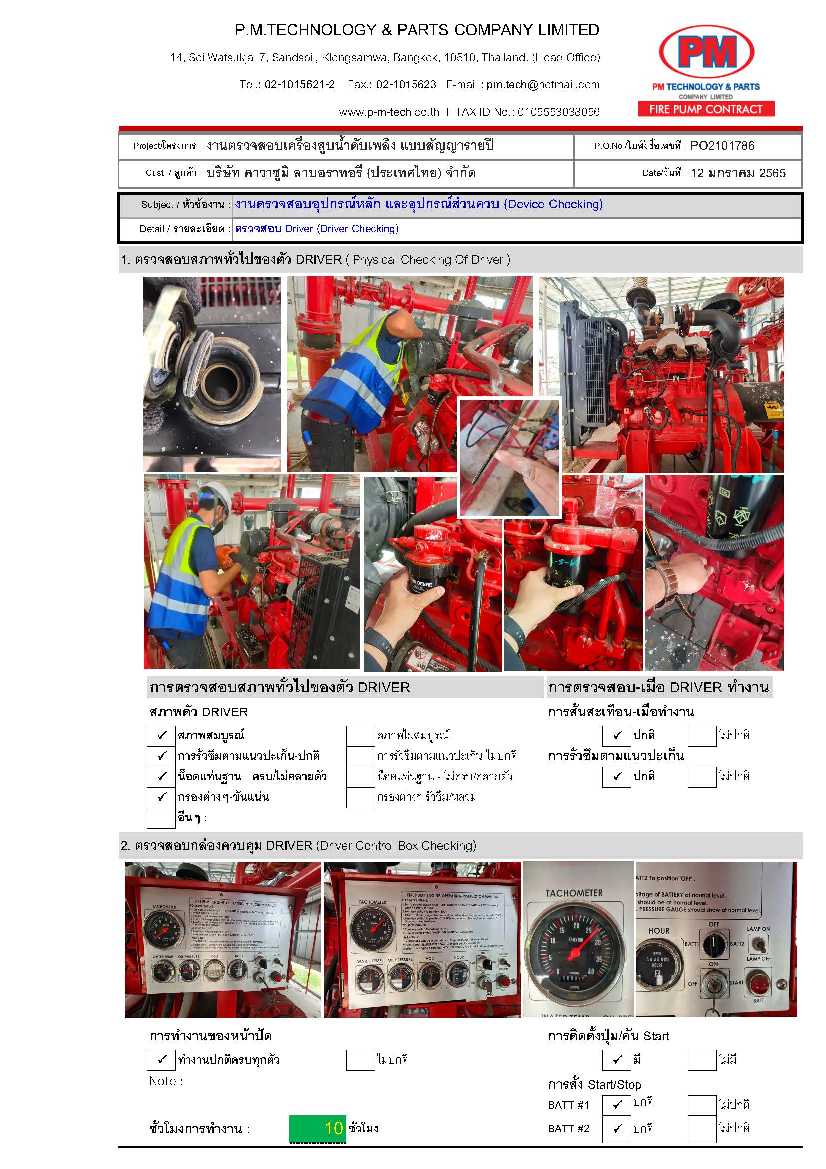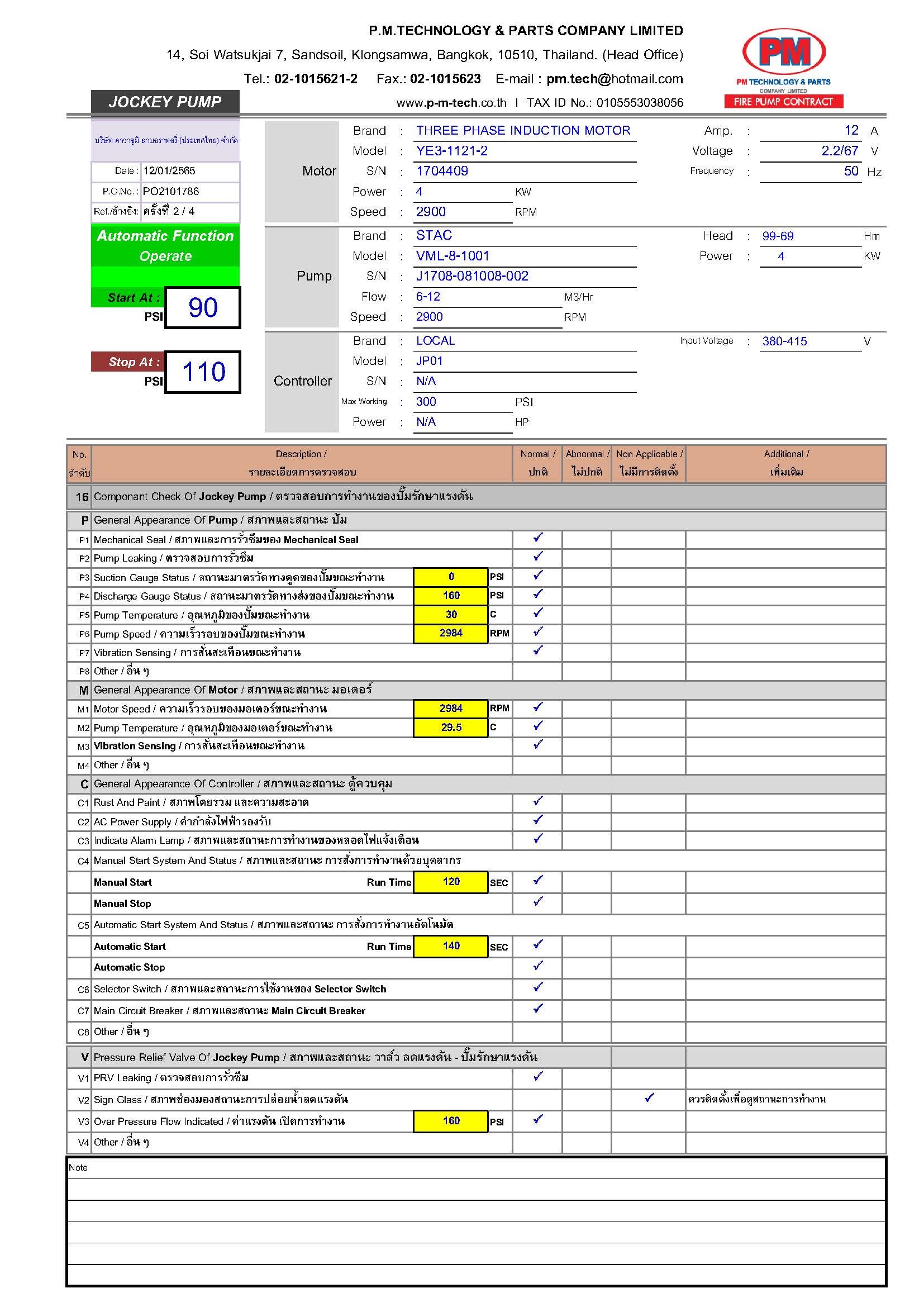 2. ตรวจสอบปั๊มดับเพลิง / แรงดันด้านดูด / แรงดันด้านส่ง / ความเร็วรอบ / อุณหภูมิ / ค่าการสั่นสะเทือน ฯลฯ