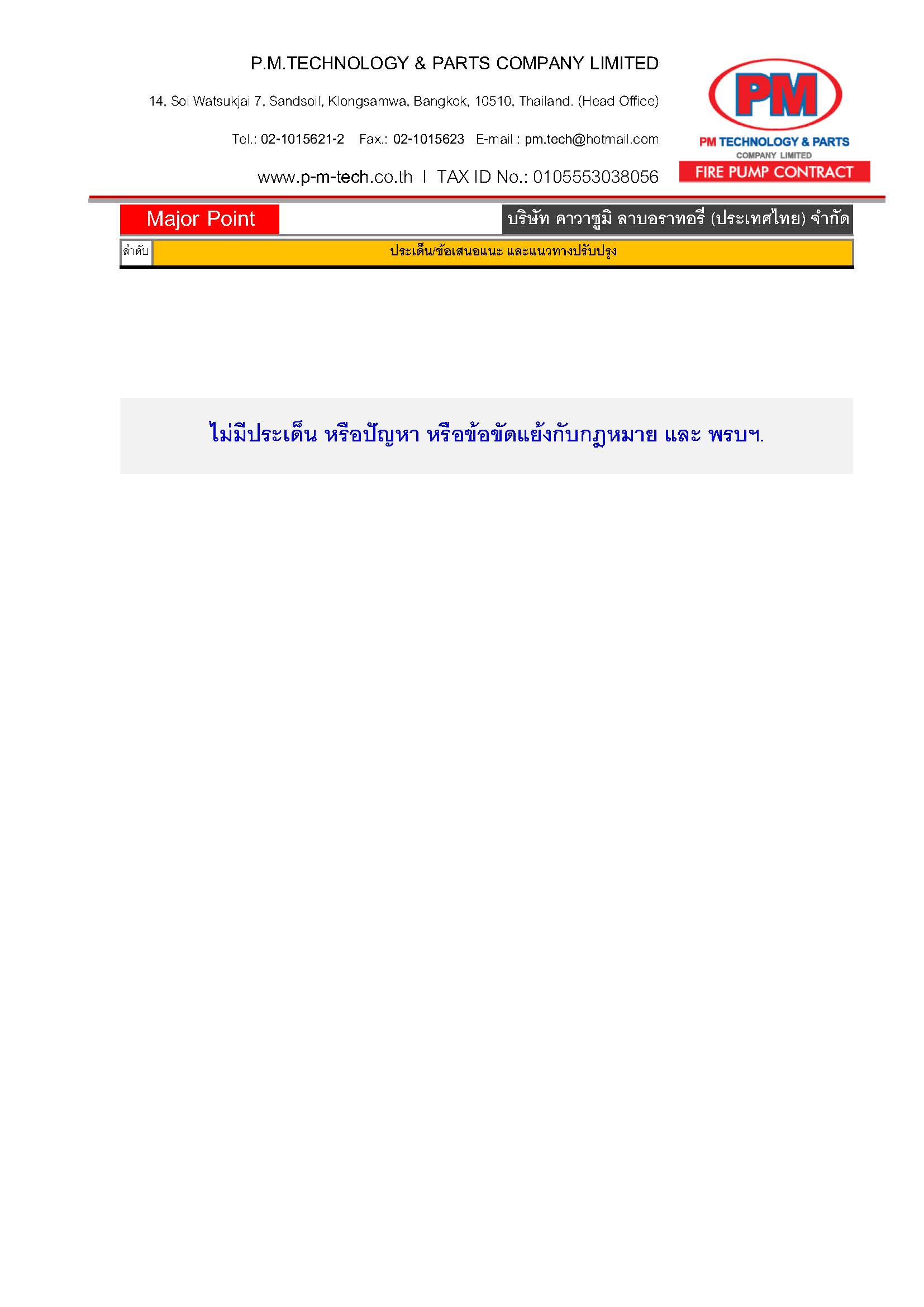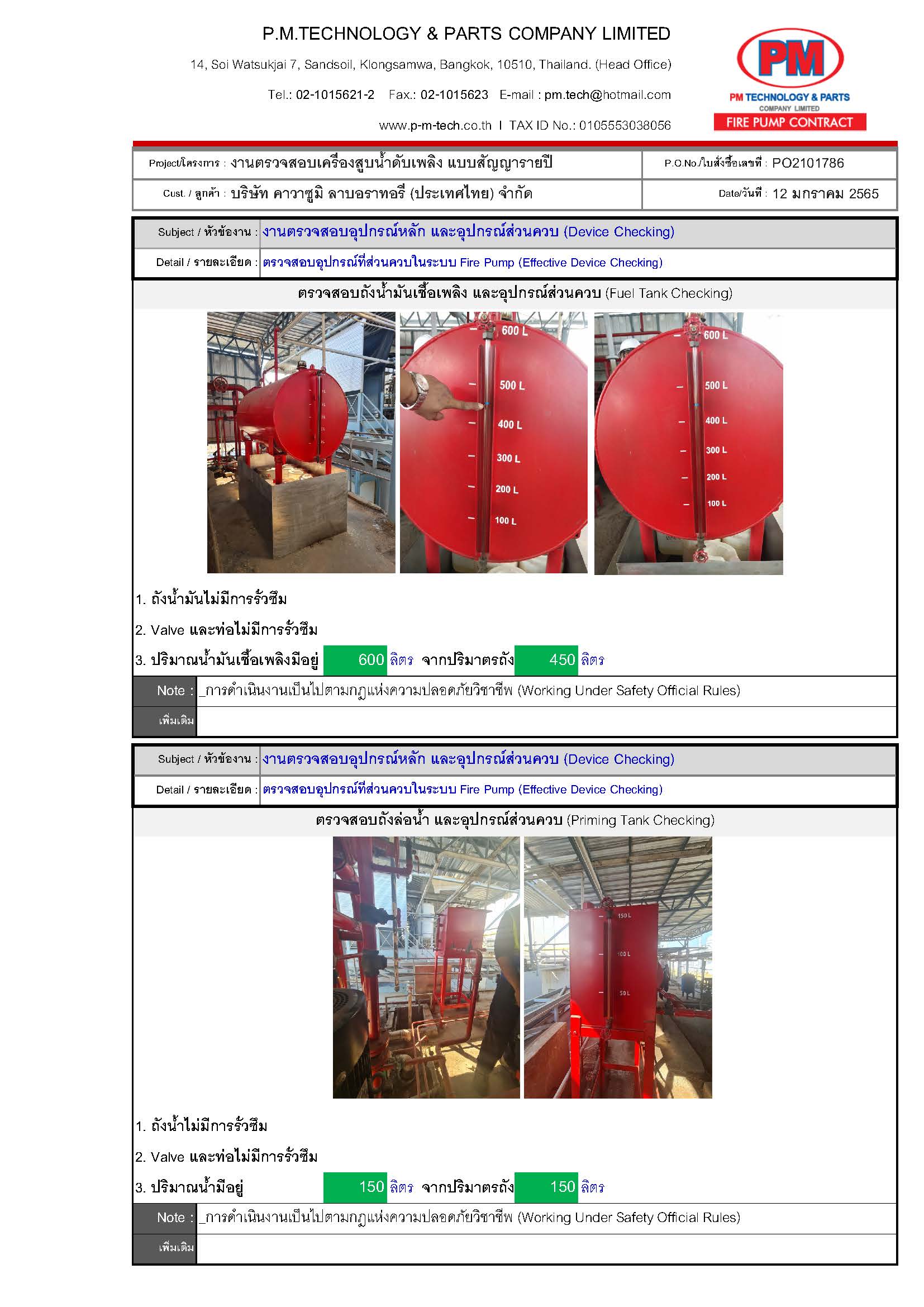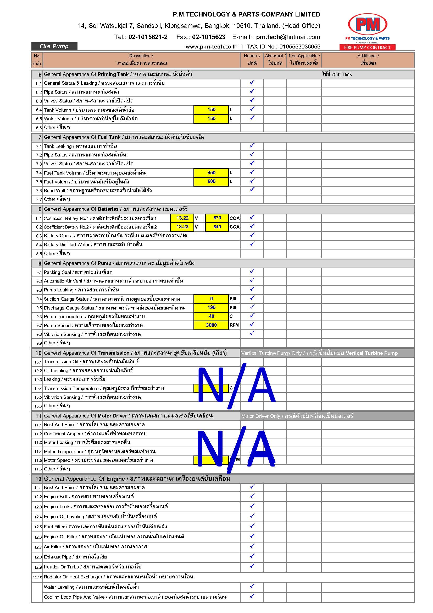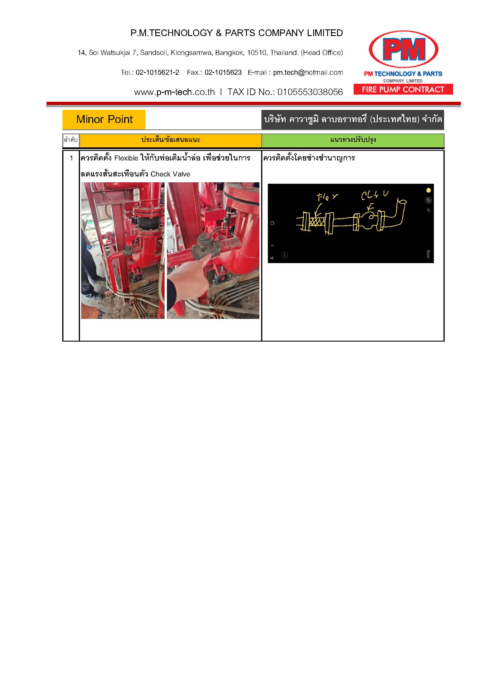 2. ตรวจสอบปั๊มดับเพลิง / แรงดันด้านดูด / แรงดันด้านส่ง / ความเร็วรอบ / อุณหภูมิ / ค่าการสั่นสะเทือน ฯลฯ